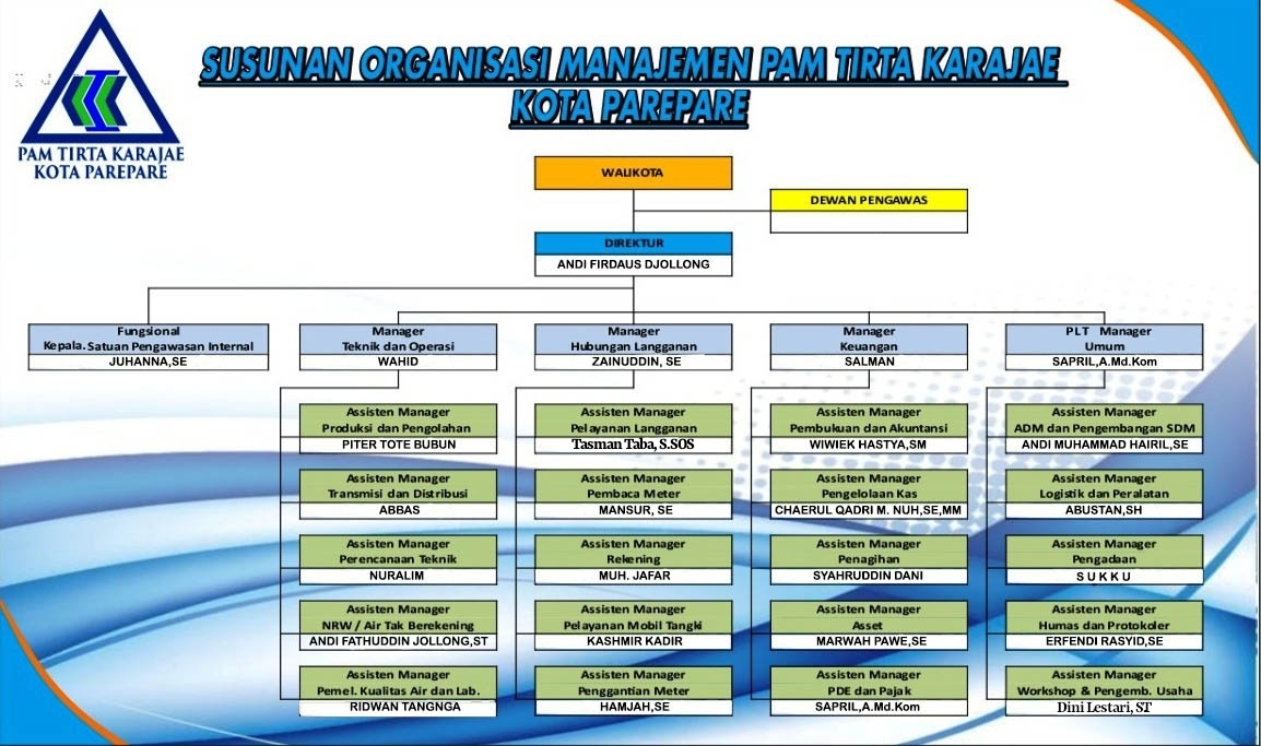 Struktur Organisasi untuk Dewan Pengawas dan Direktur diatur dalam Peraturan Walikota Parepare Nomor : 23 Tahun 2016 tanggal 19 Agustus 2016 Tentang Struktur Organisasi PDAM Parepare, sedangkan untuk pejabat sturuktural dan fungsional diatur melalui Keputusan Direktur PDAM Kota Parepare Nomor : 32/PDAM/X/2016 Tahun 2016 tanggal 17 Oktober 2016, tentang Susunan Organisasi Manajemen Perusahaan Daerah Air Minum dan Badan Pengawas Perusahaan Daerah Air Minum Kota Parepare.